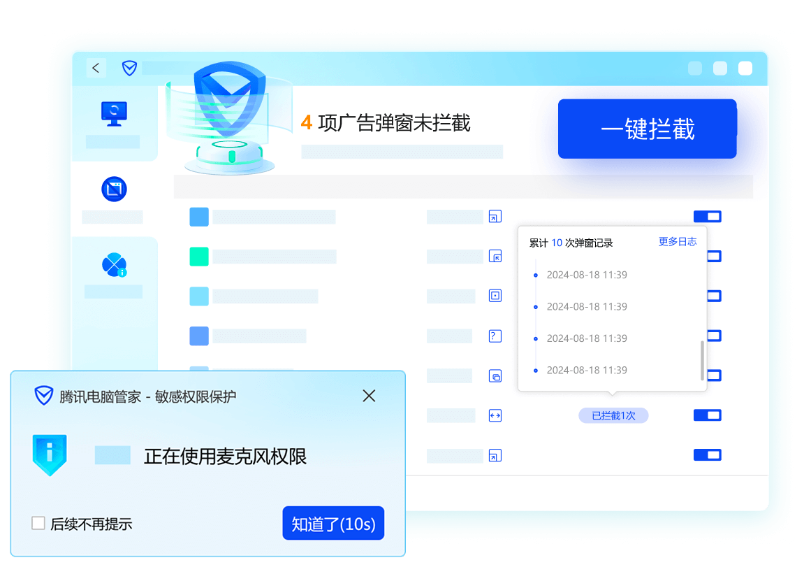 一键拦截广告弹窗,减少无用信息骚扰;实时管控摄像头 / 麦克风等敏感权限,保护隐私不泄漏。