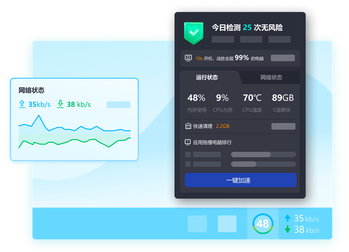 开机时长 / 实时网速 / 系统运行状态一目了然,助您深度掌控电脑性能,有效优化网络卡顿,为电脑开机加速。